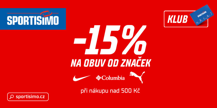 Oblíbené značky, lepší cena. V prodejně Sportisimo v našem obchodním centru nyní pořídíte obuv značek Puma, Nike a Columbia se slevou 15 %. Tato exkluzivní nabídka platí pouze pro členy Klubu při nákupu nad 500 Kč a můžete ji využít v období 28. 4.–3. 5.