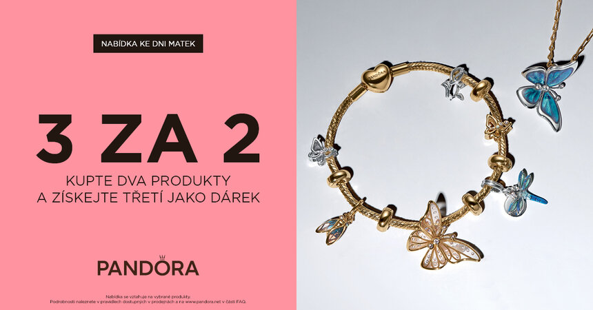 Kupte 2 produkty získejte 3. jako DÁREK. Akce se vztahuje na vybrané produkty. Podmínky akce jsou dostupné na prodejnách, anebo na www.pandora.net